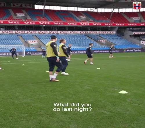 哈兰德戴麦克风参加挪威队训练,调侃队友:你喝大了
