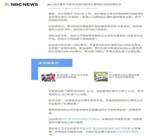 此次事件是美国媒体报道,美国这两年真刀真枪抓了不少赌球团伙并及时对外同步信息,此次抓到布莱克尼团队属于顺带披露,还不是专门侦察,作为对比,国内CBA公司并没有率先发现赌球、打假球的情况。