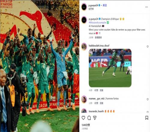 帕佩·盖耶也在赛后通过社媒晒出全队捧杯照,并配文:“非洲冠军⭐️⭐️#任务完成✅感谢真主