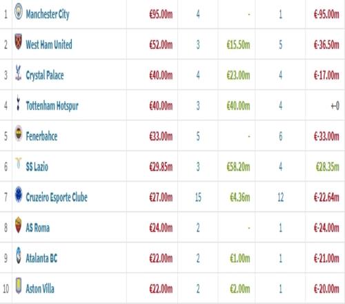 冬窗转会支出排行:曼城9500万欧领跑,西汉姆第2,前十英超占5席