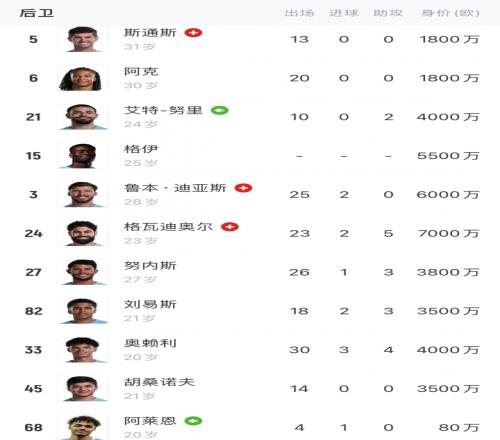 目前斯通斯、迪亚斯和格瓦迪奥尔处于伤缺状态。若3人回归,健康状态下曼城的后卫线有着夸张的厚度,后防还有门将多纳鲁马坐镇。