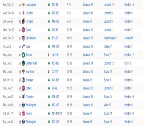 过去的6场比赛小卡只打了4场但快船全部取得了胜利,过去的15场比赛小卡只打了13场,快船也取得了13胜2负的战绩,过去的15场比赛哈登打了14场,场均登场时间哈登场均37.3分钟,小卡场均36分钟。