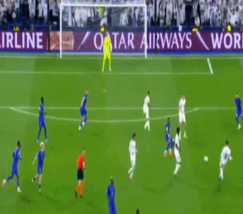第31分钟,戈洛温左路突破横传,特泽离门30米外起脚兜射,直奔球门右上角而去,击中横梁弹出,皇马逃过一劫。